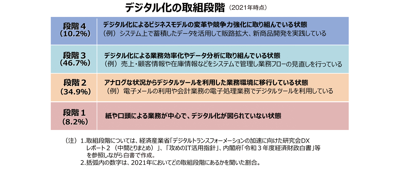 白書は「取組み段階が進展するにつれて、営業力・販売力の維持強化をはじめとする個々の効果を実感する事業者の割合は高くなる」とし、デジタル化の進展に取組み、最終的にはビジネスモデルの変革(DX)や、新たなビジネスモデルの確立につなげることが重要と結んだ。