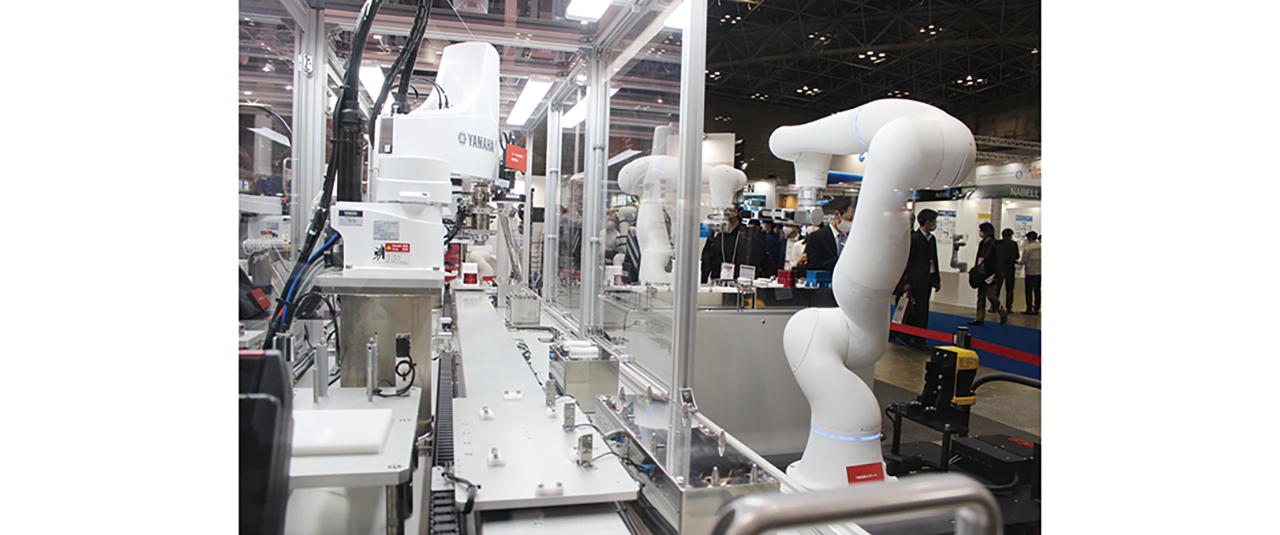 ヤマハ発動機は参考出品として全軸にトルクセンサーを付けて安全性を高めた7軸タイプ(10kg可搬)を展示した。「デジタル制御のコンベアやスカラロボットをこの垂直7軸と組み合わせることで、搬送から組み立てまでトータル提案できるのは当社だけだろう」と協働ロボット分野に新規参入した理由を話す。また「トラブルが発生した時にその発生源がロボットなのかコンベアなのかを特定するのは難しく、トータル提案できるメリットは大きい」とも話す。