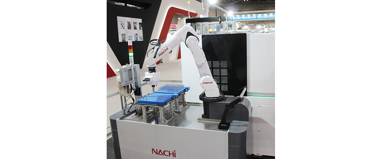 不二越も細くて軽いと好評の産業用ロボットMZの形状をベースにした「CMZ05」を参考出品した。従来のCZ-10(19年発売)の半分の可搬重量5kgとし、ボリュームゾーンを狙う。「タブレット端末でブロックを積み上げるような操作で教示でき、突然休んだ作業者の代わりがすぐに務まるようにできる」とし、台車に載せたパッケージ品の販売を予定している。