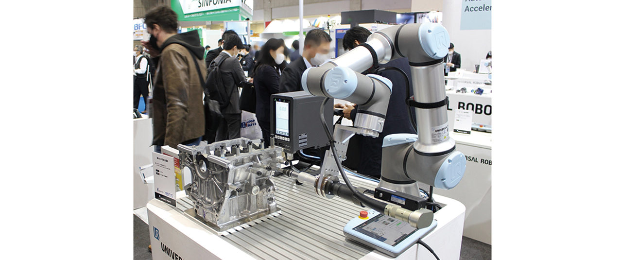 この分野で最大手のユニバーサルロボットは3〜16kg可搬機で5万台以上の納入実績を誇る。16kg可搬機で高トルクねじ締めを実演した。「一般のロボットはねじが締まった時の反力で止まってしまうが、当社のロボットは安全性はそのままに反力を受け流せる。設備構成をシンプルにできることから、完成車やサスペンションなど足回り部品メーカーで採用されている」と胸を張り、140Nmまで動作を止めずに締められることを示した。