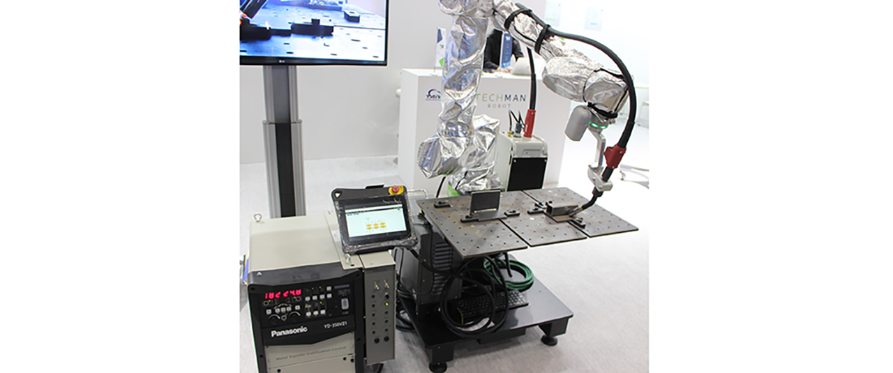 急成長を見せる台湾Techman Robotは4〜16kg可搬の4機種を揃え、パナソニックの最新フルデジタル溶接機(YD-350VZ1)とのパッケージ品を参考出品した。「溶接時に板厚の変化に合わせて電流を調節するといった細かな制御を、ロボットがインターフェースボックスを介して指示して行う」と言う。パナソニックもロボットをもつが、小型でスマートなTechman製がこうした用途に適するとし、比較的小規模の工場に提案していく考え。