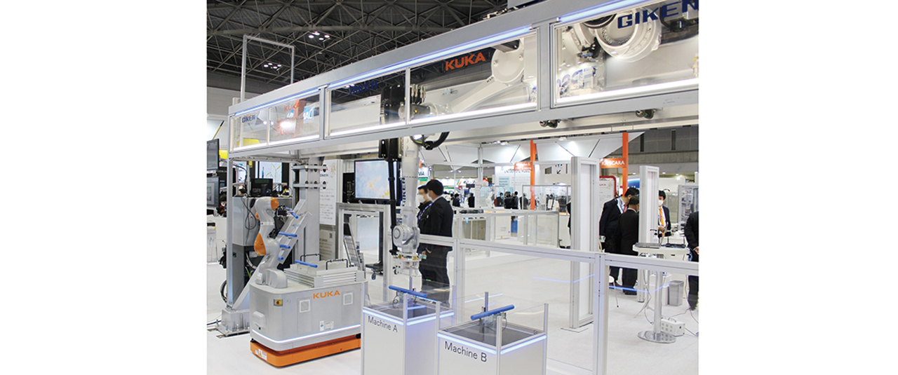 7軸ロボット(7kgおよび14kg可搬)をタフで小回りの利くAGVに載せて「LBR iiwa」として提案してきたKUKA Japanは今回、技研のガントリーローダーを組み合わせたシステムとして初披露した。最大リーチ1813mmの2本アームの6軸ロボット(20kg可搬)を含むローダーを5mほどの高さに設置することで「狙いどおりの角度でワークの受渡しができる」とする。工作機械を使う工場に向けて提案していくという。