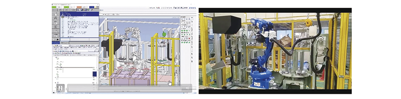 三明機工による導入シミュレーション。オフラインデバック(左)を事前に行うことで手直しなく短時間での立上げが可能に(右は実装置)