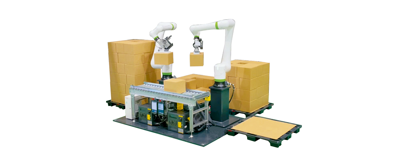ファナックの協働ロボット「CRX-25iA」(25kg可搬)2台を使ったデパレタイジング。リーチの長さ(1700mm)が生きる。