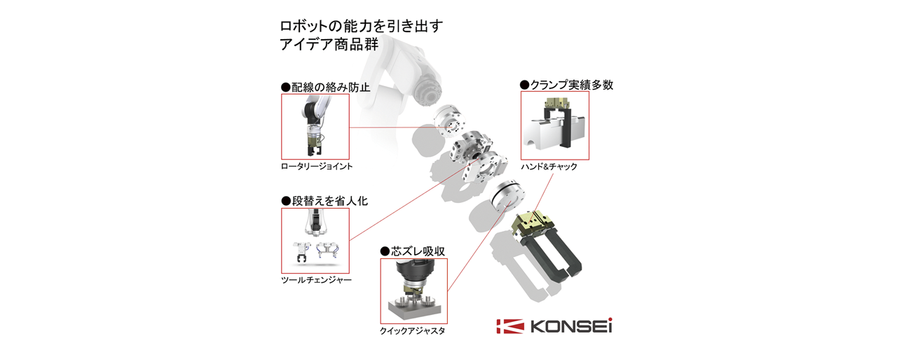 ■ 近藤茂充(近藤製作所) 当社はエンドアームツールメーカーですが、もともとは自動車部品メーカーで、いわば社内にエンドユーザーがいるような会社です。自動車部品事業を通して自分たちがほしい自動化を進め、FAシステムだけでなく旋盤も作れるシステムインテグレーター(SIer)としてもお客様へサービスを提供しています。ニーズを捉えてお客様と一緒に開発することをポリシーとしており、「ニーズをかたちに」を合言葉に自分たちがほしいと思えるハンドやチャック、ツールチェンジャー、着座のばらつきを吸収するクイックアジャスター、配線・配管の絡まりを抑えるロータリージョイントなどを標準化して提供しています。