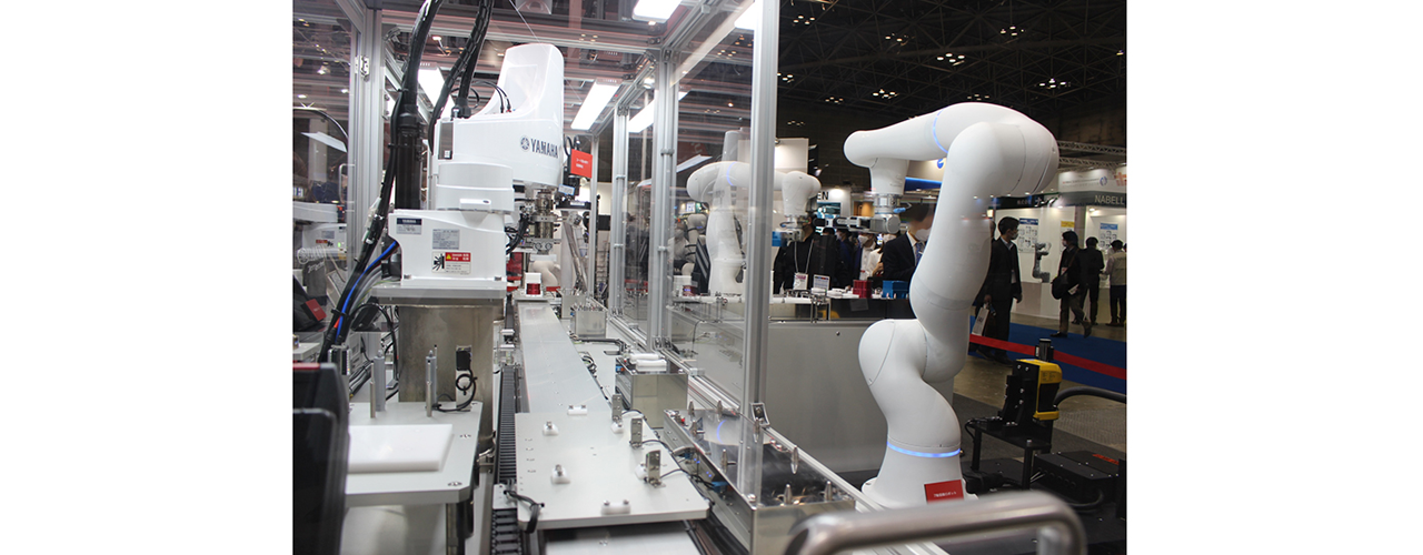 ヤマハ発動機の7軸協働ロボット(右)とスカラロボット&デジタルコンベアの組合せ