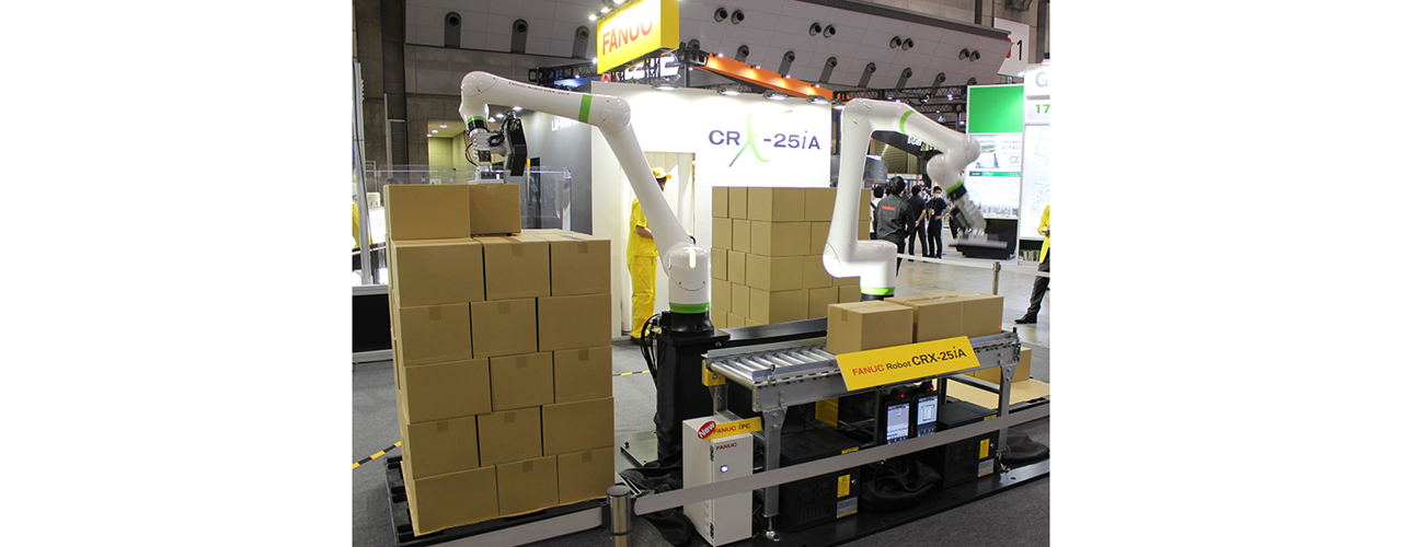 長いリーチをもつファナックの協働ロボット「CRX-25iA」(25kg可搬)を使ったパレタイジング