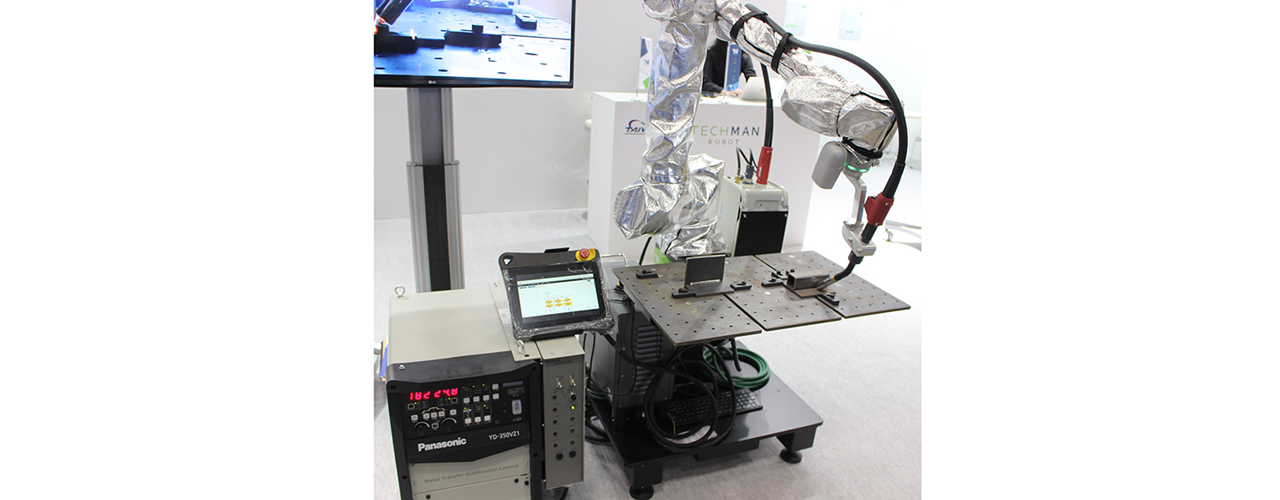 急成長を見せる台湾テックマンロボットは4〜16kg可搬の4機種を揃える。新たな用途としてパナソニックコネクトの最新フルデジタル溶接機(YD-350VZ1)とのパッケージ品を開発中。「溶接時に板厚の変化に合わせて電流を調整するといった細かな制御を、ロボットがインターフェースボックスを介して指示して行う」そうだ。