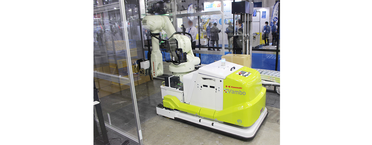 活躍の場が急拡大しているのはマテハン分野だ。川崎重工業が新たに提案を始めたのはデバンニング・ピッキング・パレタイズ工程の自動化。AGVと一体化したデバンニングロボット「Vambo」は3次元AIビジョンでコンテナからサイズの異なる段ボール箱を取り出してコンベアに載せる。「80kg可搬の多関節ロボットとAGVの組合せはまずない」とし、作業の進行に合わせてAGVが進んでコンテナの奥にアクセスする。