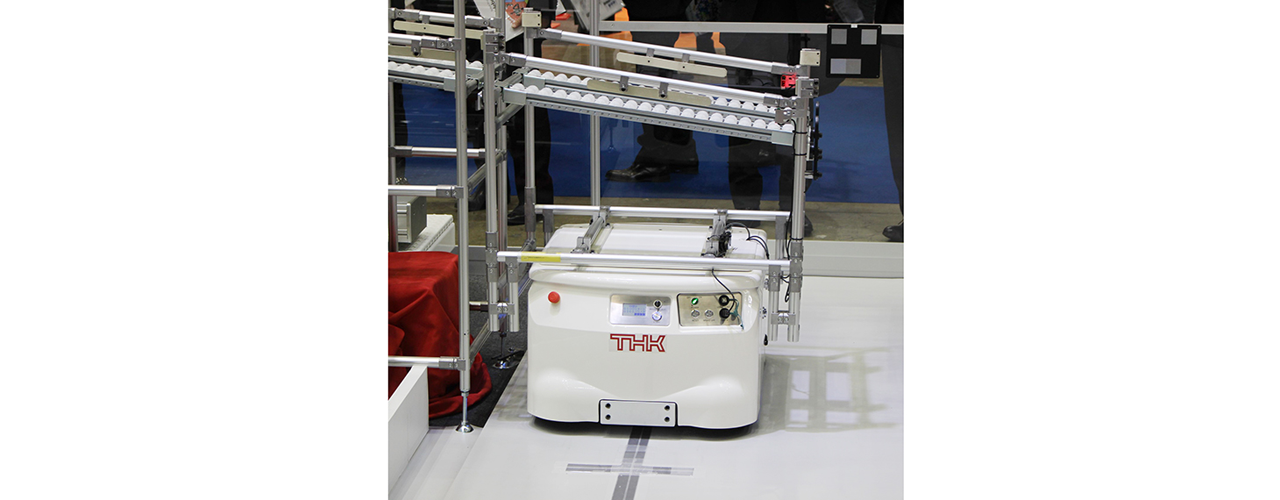 THKのAGVはその上方右にあるQRコードに似たサインポストで自動走行する。