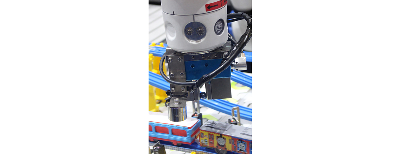 ハンドやチャックなどロボット周辺機器を多数用意する近藤製作所の非接触ロータリージョイント「RJM」は、ロボットアーム先端とその先をつなぐ。「情報も電力も非接触でハンド側へ送れるので、ハンドを360度以上回転させても電源コードなどが絡まることがない」と言う。
