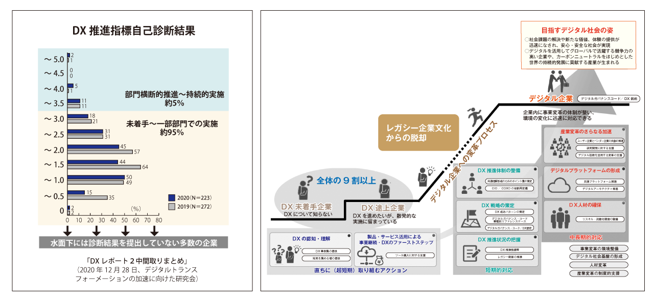 レポートによると、経産省のDX指標で企業が自己診断した結果、20年10月時点で診断結果提出企業(約223社)の9割以上がDXにまったく取り組めていないレベルか、もしくは散発的な実施に留まっている状況にあることが明らかになりました。コロナ禍前の19年とあまり変わっておらず、「テレワークなど既存業務での部分的なデジタル化に留まり、データ・デジタル技術を活用したビジネスモデルの変革=DXの本質にまで至っていない」というのが実情のようです。